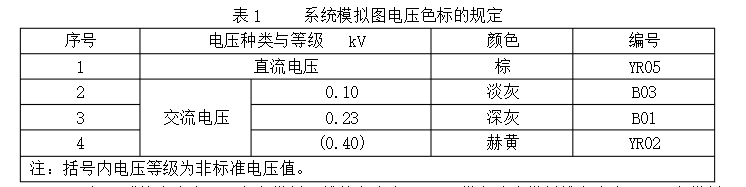 10.3體系模擬圖應(yīng)依據(jù)運(yùn)轉(zhuǎn)電壓等級,按表1規(guī)則的色彩標(biāo)明,色彩所對應(yīng)的色標(biāo),由制作廠或制作廠與用戶之間洽談確定。