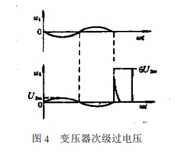 另一方面,直流屏變壓器溝通側(cè)也會因為大容量負(fù)載如大變比變壓器的合閘瞬間、其它負(fù)載堵截電源時以及整流變壓器電刀閘的開關(guān)斷開,也會因為初次級繞組間的分布電容,變壓器的鼓勵電流的驟變在次級發(fā)生瞬時過電壓,其尖峰值可達作業(yè)電壓峰值的6倍以上,如圖4所示。