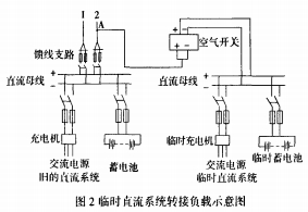 在對(duì)現(xiàn)場(chǎng)原有直流體系饋線網(wǎng)絡(luò)進(jìn)行仔細(xì)核對(duì)后,擬定了替換計(jì)劃,整體的替換思路是:樹立一個(gè)簡(jiǎn)易的暫時(shí)直流體系,使用暫時(shí)體系轉(zhuǎn)接負(fù)載。如圖2所示。