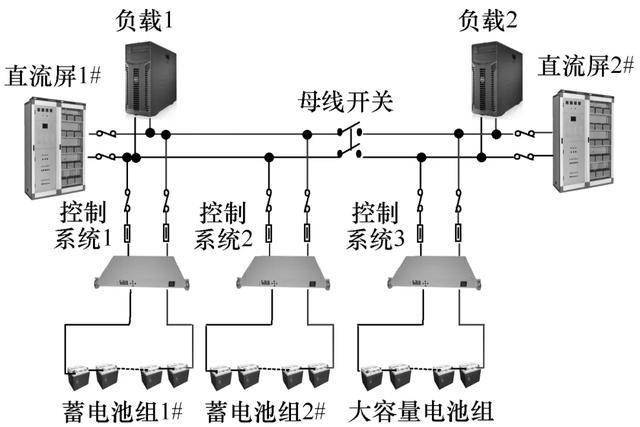 將原有的兩組蓄電池通過本文方法進(jìn)行并聯(lián)使用,形成容量更大的蓄電池系統(tǒng)接入直流母線1將另一個大容量的新蓄電池組及相應(yīng)的控制系統(tǒng)接入直流母線2。在運(yùn)行幾年后,待原有的兩組蓄電池到了使用壽命后,再更換成新的大容量的蓄電池組,將提高蓄電池組的利用率,降低電池采購成本。