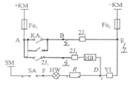 如圖1所示,當(dāng)圖中的A點(diǎn)和B點(diǎn)同時(shí)接地,相當(dāng)于A、B兩點(diǎn)通過大地相連接起來(lái),中間繼電器2J1動(dòng)作生成斷路器的跳閘。同理,當(dāng)圖中的A點(diǎn)和C點(diǎn)同時(shí)接地,或圖中的A點(diǎn)、D點(diǎn)同時(shí)接地均可能生成斷路器的跳閘。