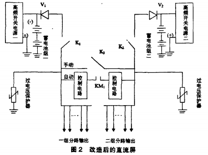 改進(jìn)后的直流屏添加刀閘K1、K2K3,兩個(gè)阻隔二極管V1V2,直流接觸器KM,及操控回路。這樣能更好地操控電源的輸人切換,便于保護(hù)。