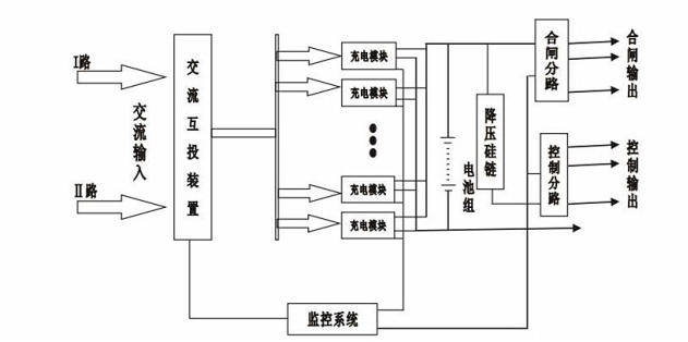 常規(guī)直流屏由溝通配電模塊、充電模塊、配電監(jiān)控模塊、降壓硅鏈等零件構(gòu)成。如圖1為典型的直流屏結(jié)構(gòu)系統(tǒng)。